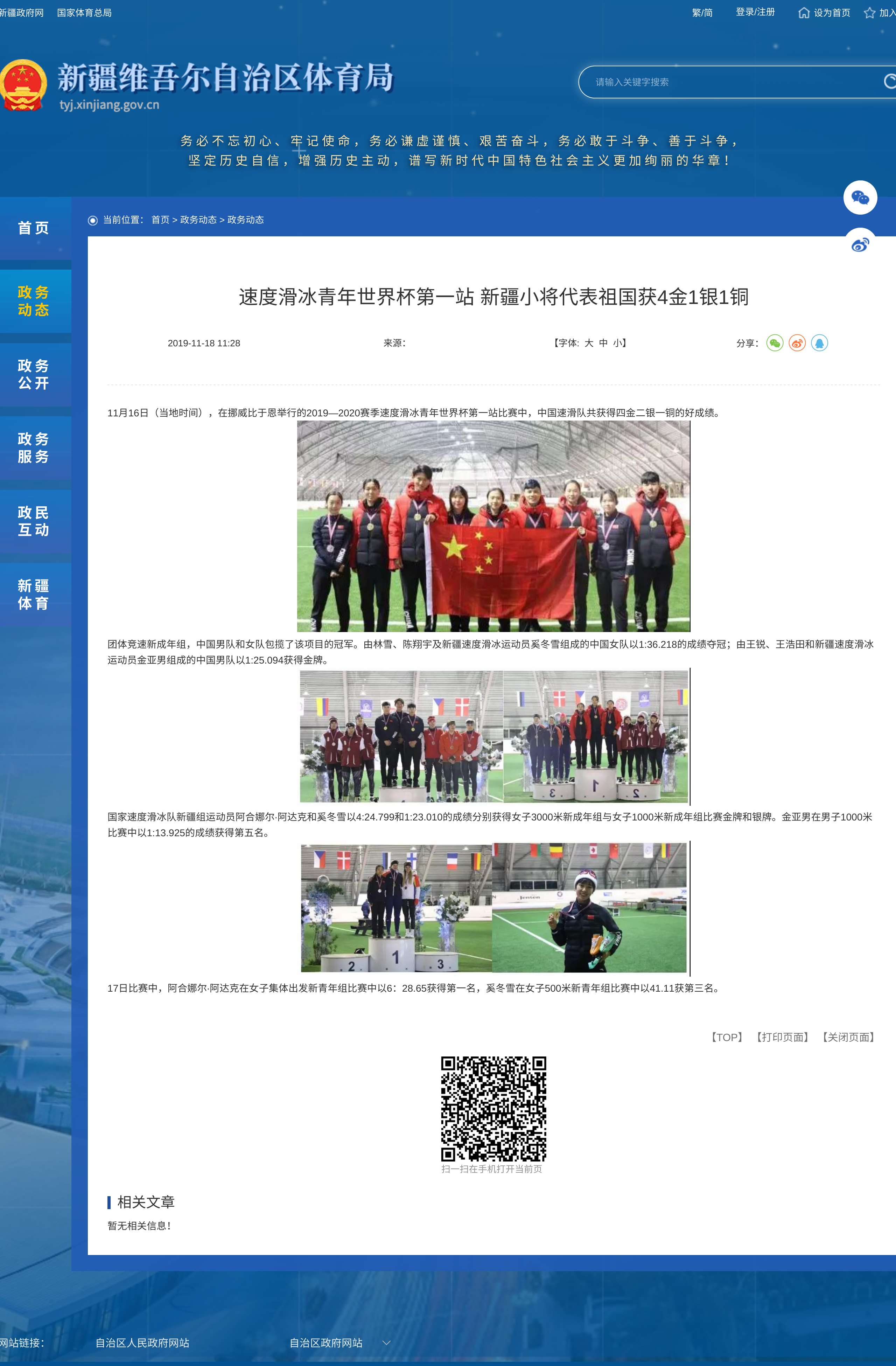 速度滑冰青年世界杯第一站 新疆小将代表祖国获4金1银1铜.新疆维吾尔自治区体育局.2023-10-06