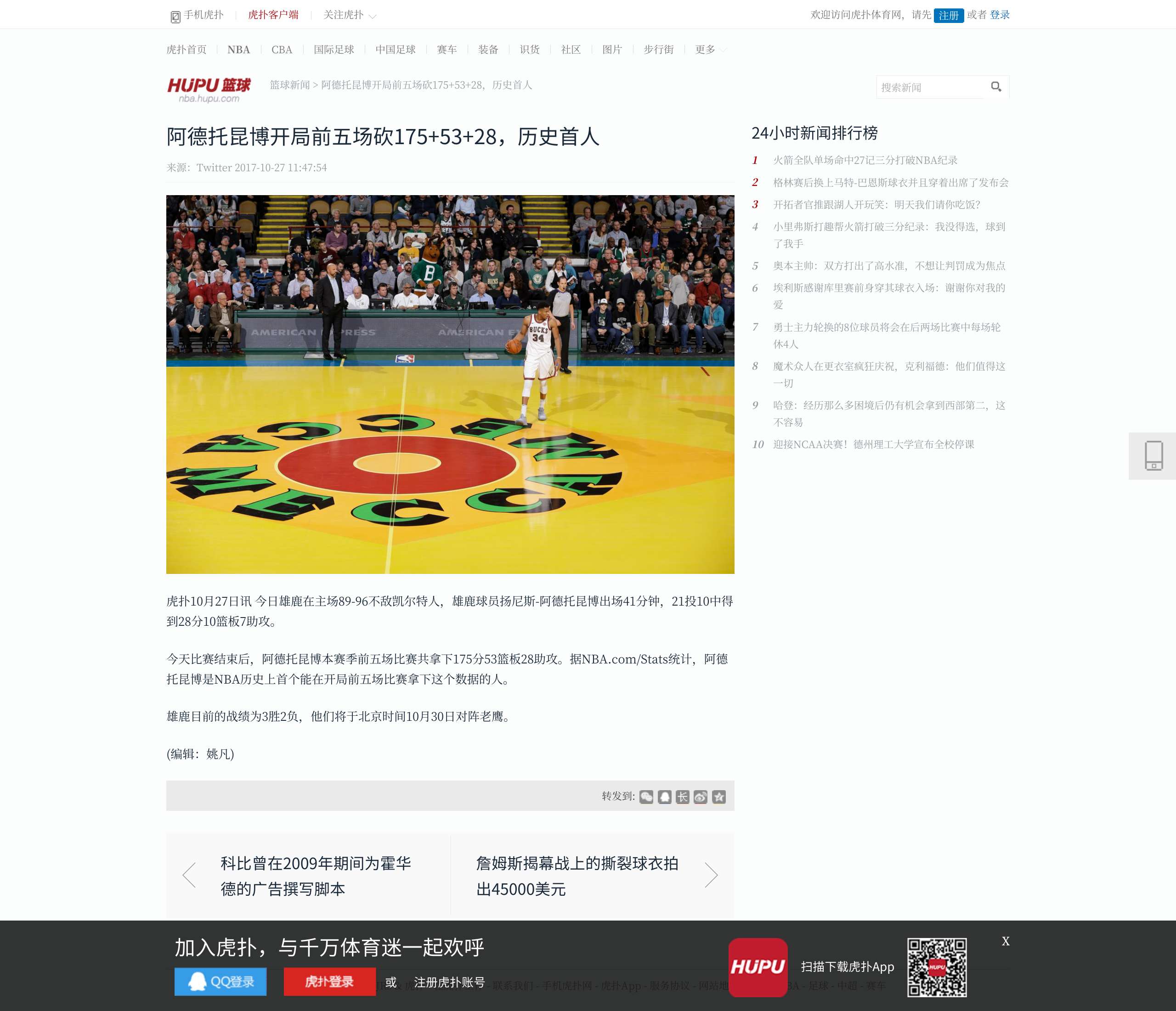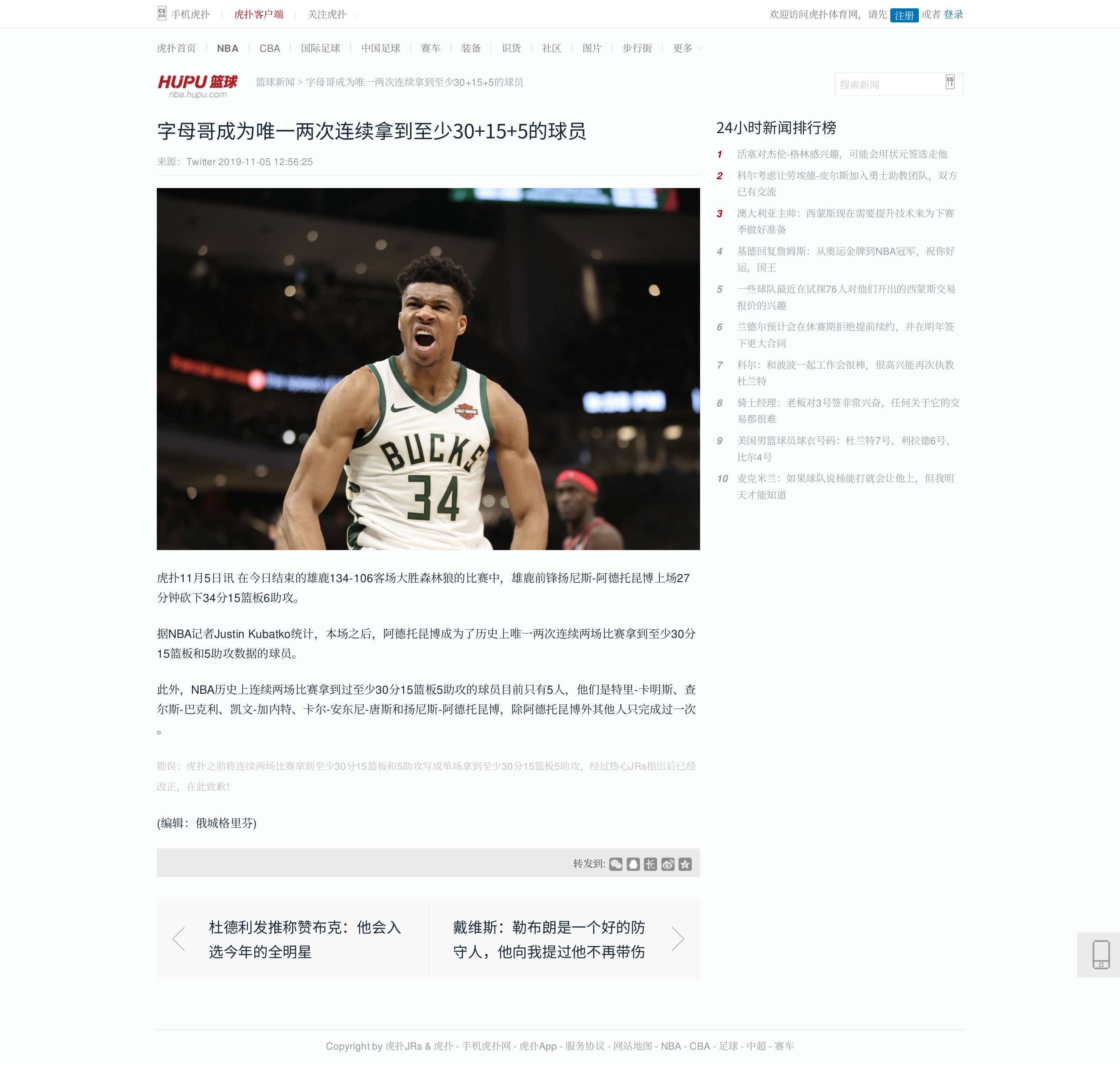 [流言板]字母哥拿到生涯第127次30+10+5,追平詹姆斯并列历史第四.虎扑.2024-04-09